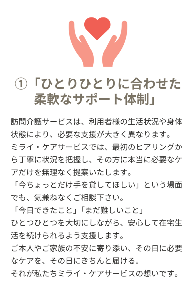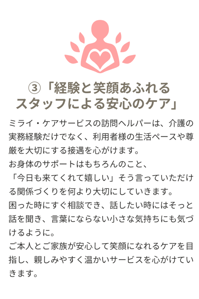 地域の皆さまに寄り添い、安心して家族それぞれが毎日を過ごしていただけるよう、私たち「訪問介護事業所ミライ・ケアサービス」は、東広島の地で誕生しました。